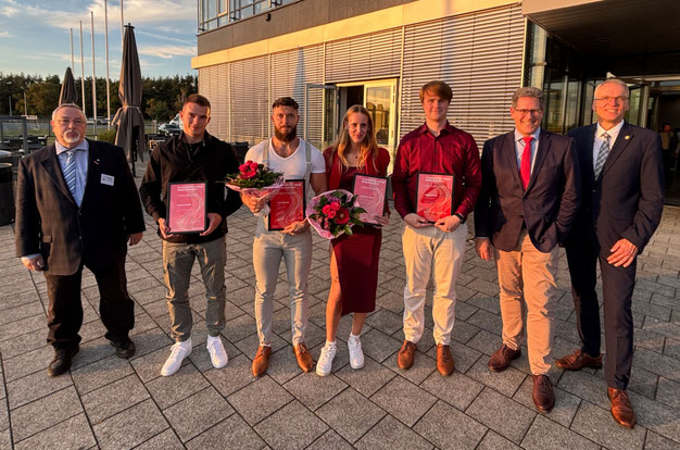 Auf dem Bild (von links): Kreishandwerksmeister Achim Aschenbrenner, Leander Schmitz, Tom Tzschapke, Svenja Änne Falter, Niklas Brammer, Marcus Freudenreich – Sparkassenstiftung Lüneburg, Landrat Jens Böther